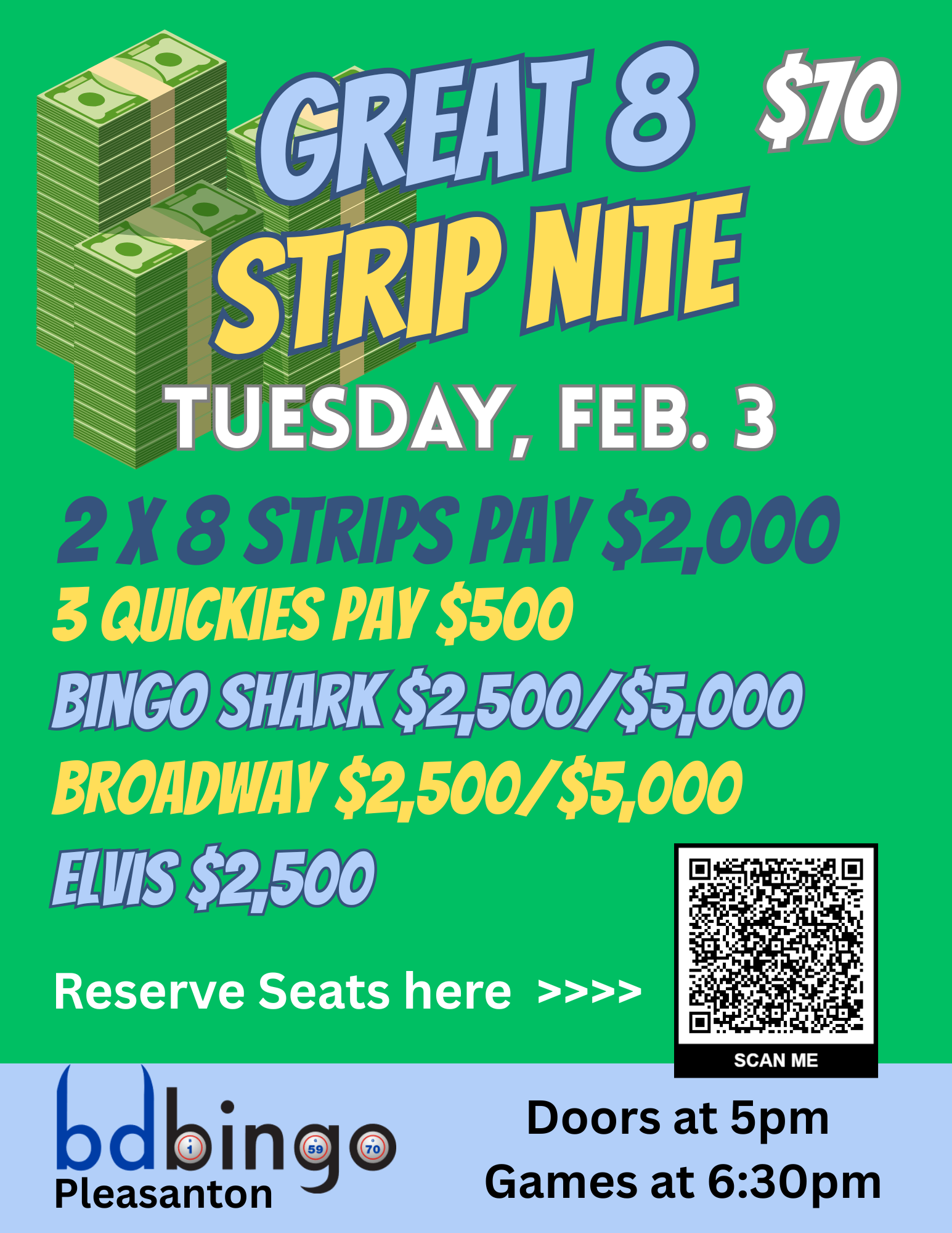 GREAT 8 STR1P NITE Tuesday, February 3 70 Buy-1n Includes: --Reserved Seat --2 Packs of 8 Str1ps paying 2,000 each --3 Quickies paying 500 each --1 Bing0 Shark (2,500/5,000 PINK) --1 Broadway (2,500/5,000 PINK) --1 Elvis (2,500) Doors open at 4:30pm Main program starts at 6:30pm Tickets on Sale Saturday, Jan. 10 at 5pm |