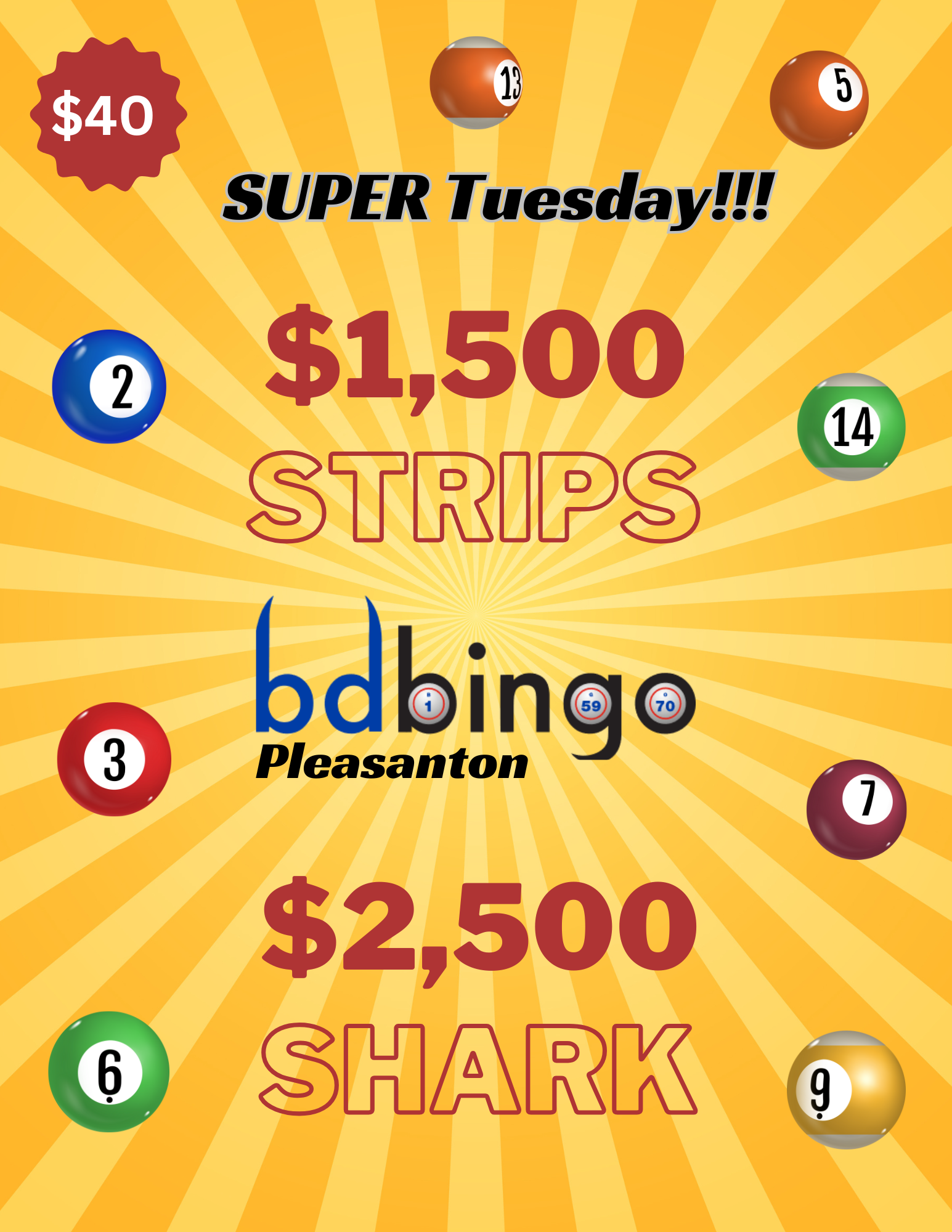 Join us for Super Tuesday! Just 40 Gets You: --2 Packs of 8 Str1ps paying 1,500 each --3 Quickies paying 500 each Sold Separately: 2,500 Shark Must Go Broadway Progressive Doors open at 5pm Games start at 6:30pm |