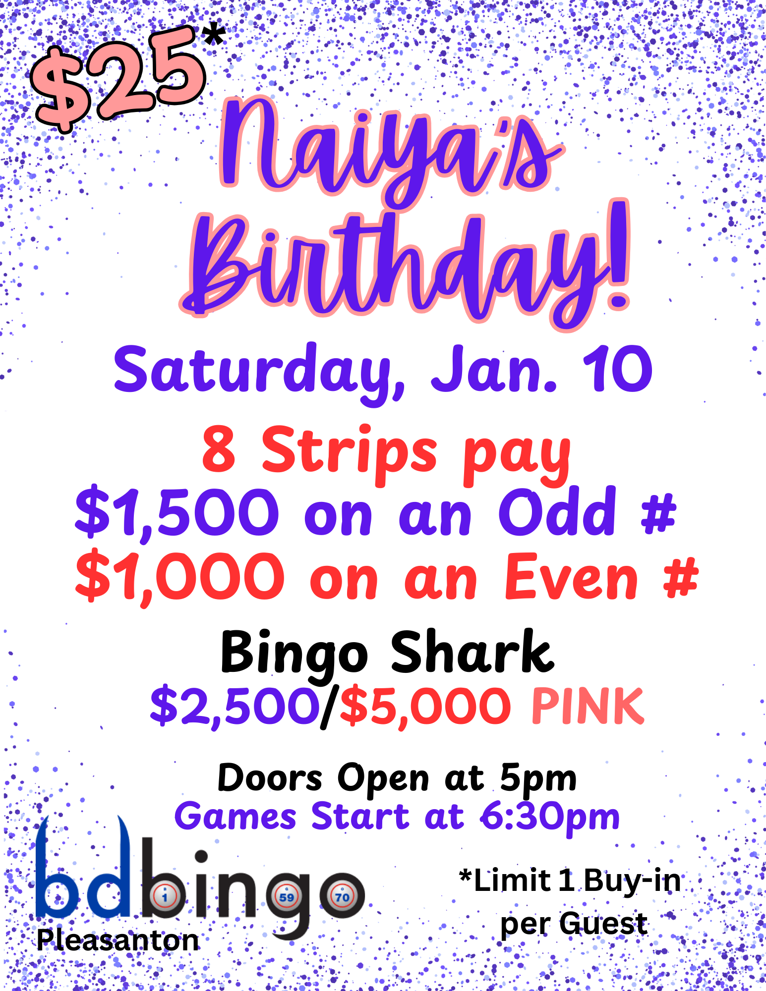 Naiya's Birthday Bash is THIS SATURDAY! It's the Best Bing0 Deal in the Bay! Just 25 Gets You: --2 Packs of 8 Str!ps paying as follows: --1,500 for a Bing0 on an odd # --1,000 for a Bing0 on an Even # --1 Pack of 3 Quickies paying 500 each *********** Sold Separately: Specials 4-Pack including Broadway Progressive Bing0 Shark @2,500/5,000 PINK |
